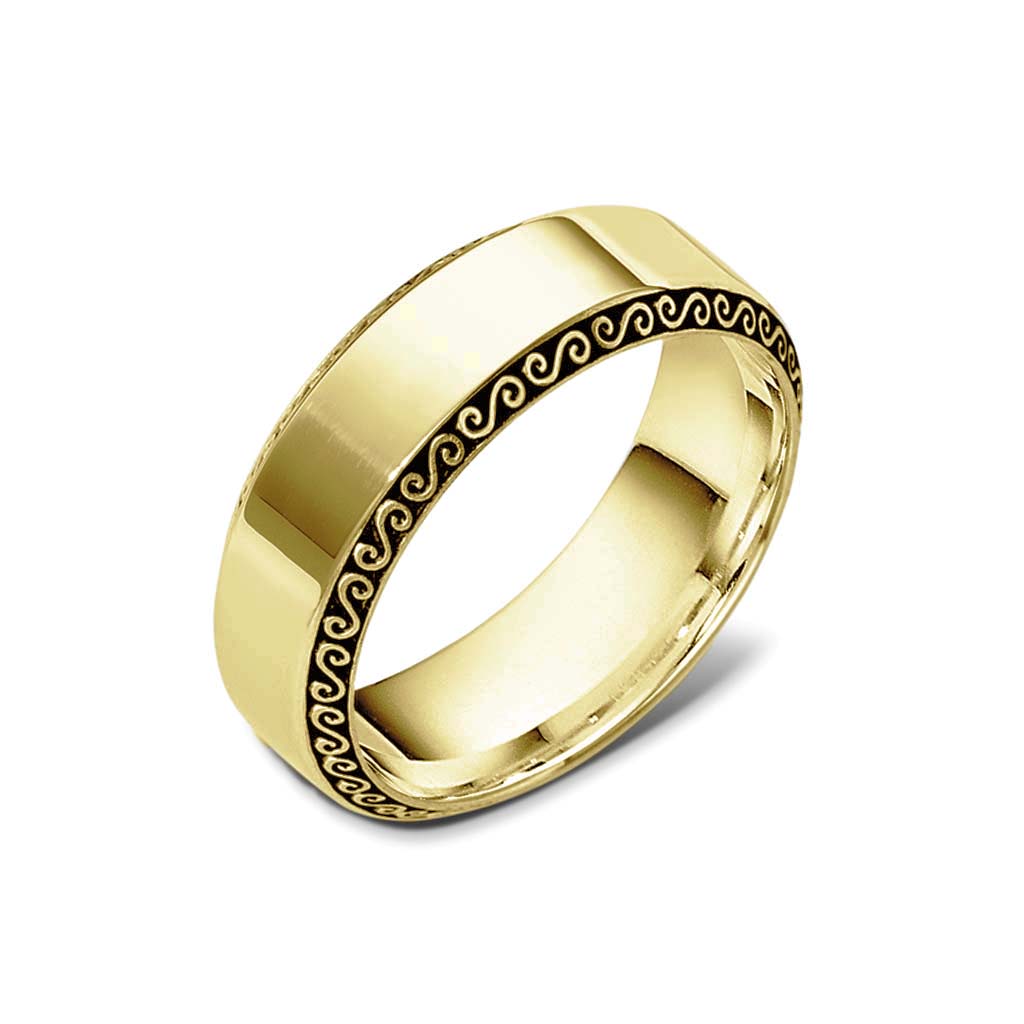 A classic scroll pattern is used to inspire this cutting edge but versatile wedding band. The scroll travels along each edge of the band. Our yellow gold version of this band is available in 10k, 14k or 18k. Please use our filter to make your personalized selections or contact us if you cannot find what you are looking for.
